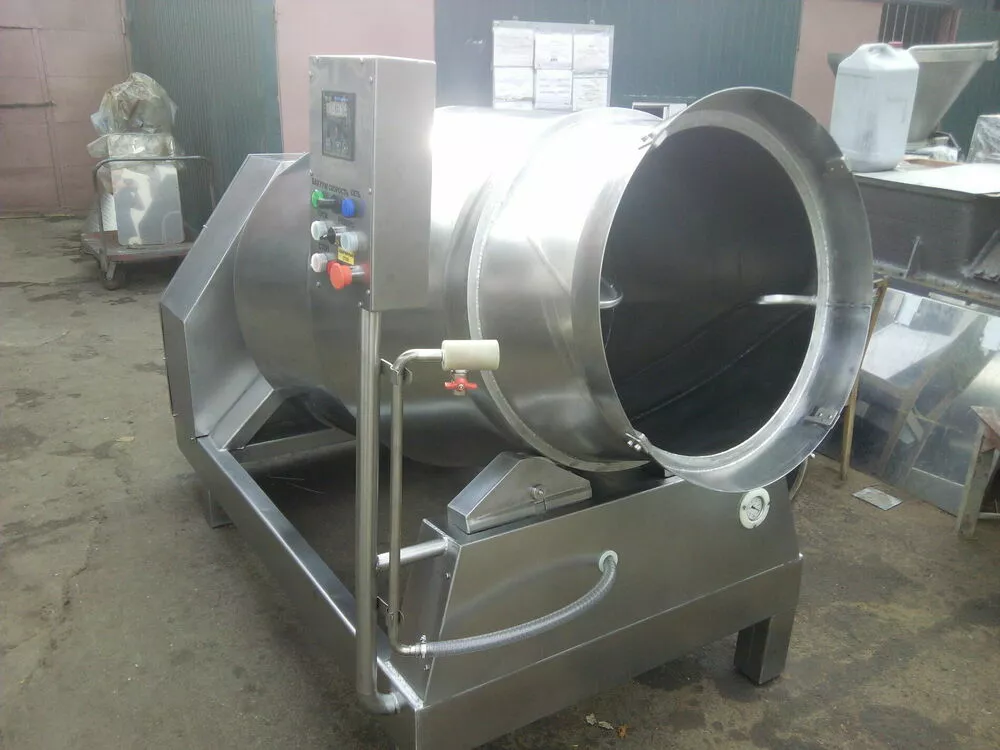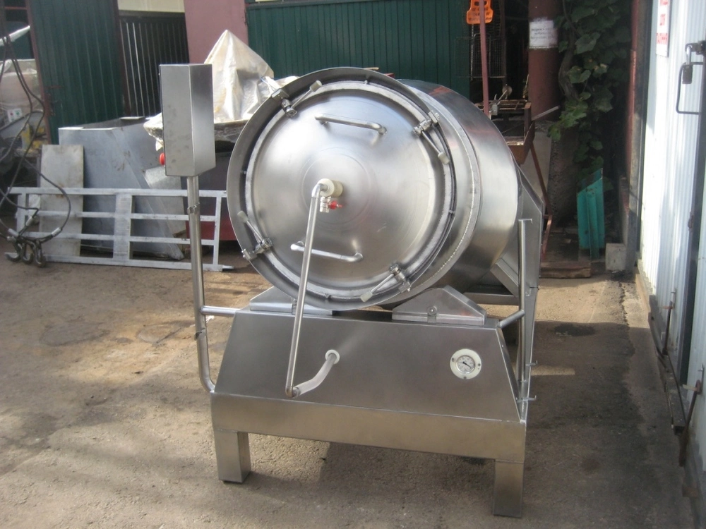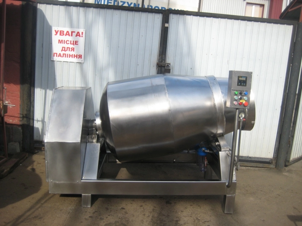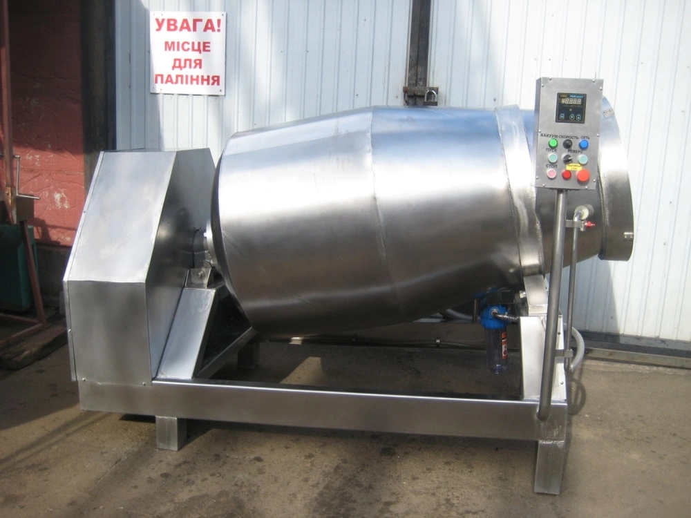 Массаж осуществляется путем равномерного перемешивания мяса внутри вращающегося барабана, мясные волокна хорошо пропитываются рассолом и специями, при этом не нарушается структура тканей, белковых соединений, куски мяса сохраняют свою целостность, что улучшает их окраску и композицию на срезе. Все детали массажера мяса, соприкасающиеся с продуктами, выполняются из нержавеющей стали. Высокая эффективность посола обеспечивается значительной долей вакуума, который создается за счёт работы специальных вакуумных процессоров, который создаётся за счёт работы специальных вакуумных процессоров, которыми оснащаются вакуумные массажеры мяса. - выполнение из кислотостойкой стали; - точно рассчитанная конфигурация барабана и система лопастей барабана; - микропроцессорный пульт управления; - плавная регулировка всех параметров массирования, возможность " паузы "; - система регулировки вакуума, не требующая обслуживания; - многоступенчатая система защиты вакуум-насоса; Объем барабана \ л 900Максимальная загрузка (кг) -500 Обороты барабана (1\ мин) 0-9 Достигаемый вакуум (%) 95Габариты ширина\глубина\высота (мм) 1350х2100х1600Мощность двигателя барабана (кВт) 2,2Мощность двигателя вакуумного насоса (кВт) 1,1Производительность вакуумного насоса (м3\час) 21Напряжение питания (В) 380Частота (Гц) 60Масса (кг) 650